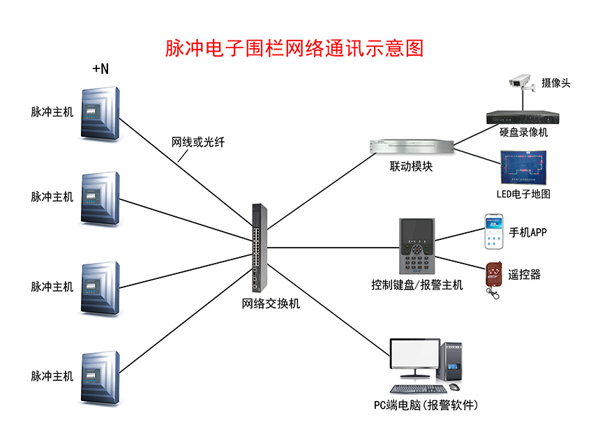 脈沖(chōng)電子圍欄報(bào)警系統示意圖——網絡(luò)通訊+LED電(diàn)子屏+語音