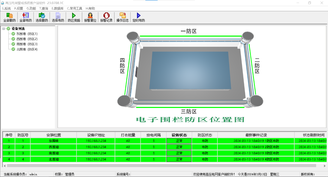 ●  功能:管理控制前端高壓電網主機、分控主機;實時監控前端電網圍欄防區狀态以及對防區參(cān)數設定;支持報(bào)警信息、軟件操作信息查詢導出